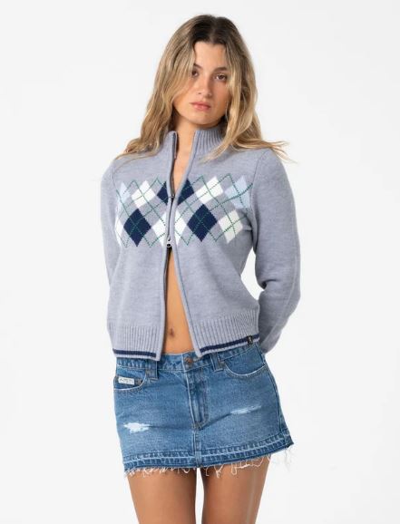 Product Description Fitted Knit With Double Ended Zip And Argyle Detail. 55% Acrylic / 45% Cotton Zip Thru Closure Long Sleeves Fitted Waist FITTED