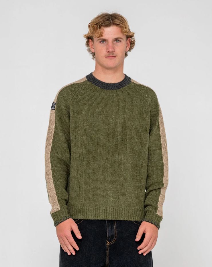 Product Description R2K Boxy Fit Crew Neck Chunky Knit With Contrast O/Arm Stripe And Rusty Exterior Patch. Yarn 3.1 Crew Neck Boxy Fit Wool Blend