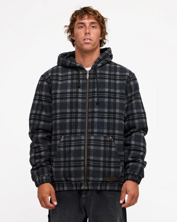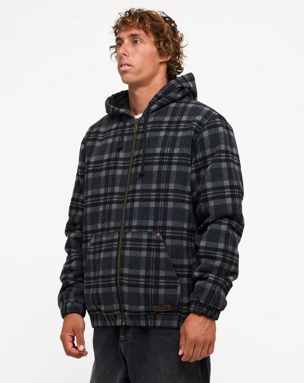 Product Description Hooded zip thru fleece jacket 100% Cotton Bomber style fit Yarn dye check Copper rivet details on pouch pockets Taffeta quilted lining throughout Large scale immortal collection embroidery on back Immortal collection trim on front