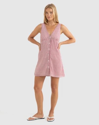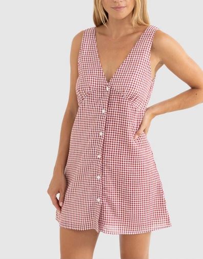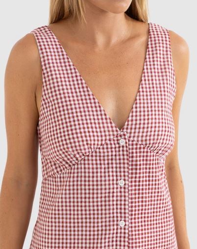 Product Description - Pure cotton fabric- V-neckline- Sleeveless- Button-through front- All-over check print- Mini length