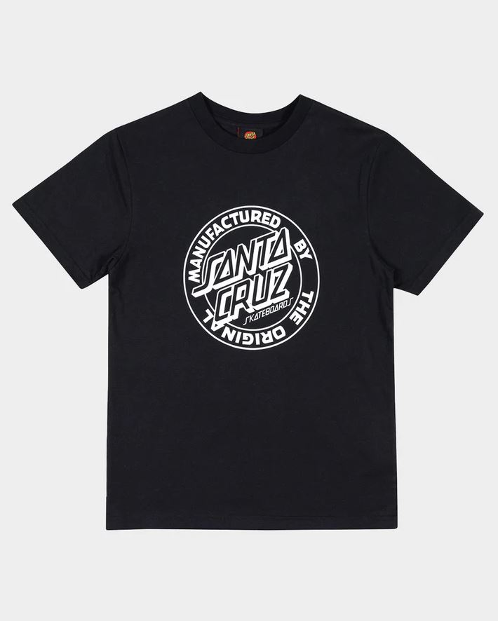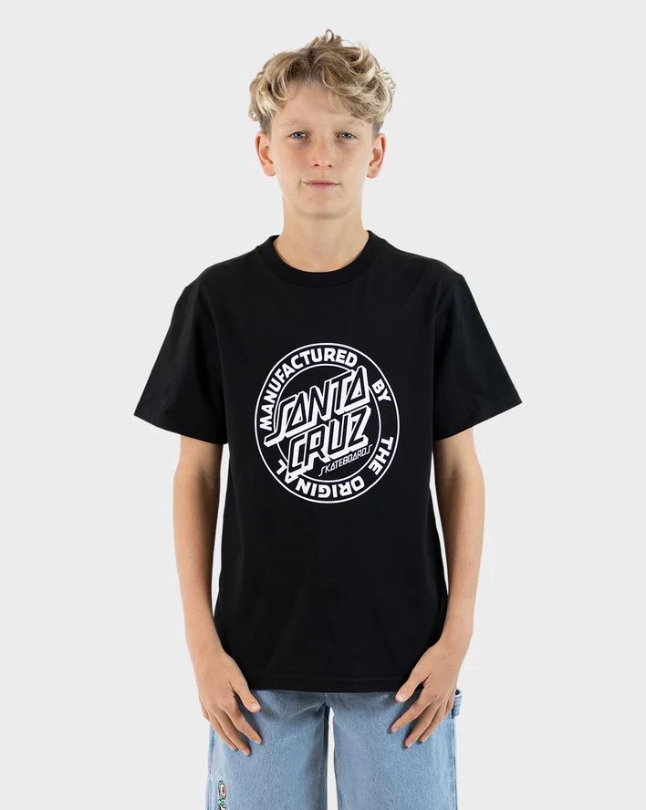 Product Description Boys shorts sleeve Santa Cruz regular fit t-shirt featuring screen print of the MFG Dot logo.